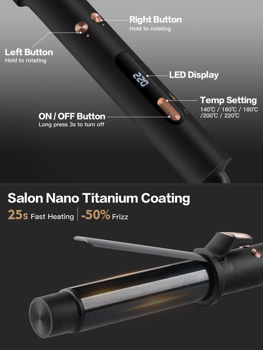• [LOCKING SHINY FLAWLESS CURLS] Our rotating curling iron feature MCH heating technology and titanium nano-coating to ensure fast, even heating to prevent damage to your hair. The millions of ionic nourish the hair, keeping it healthy and shiny.